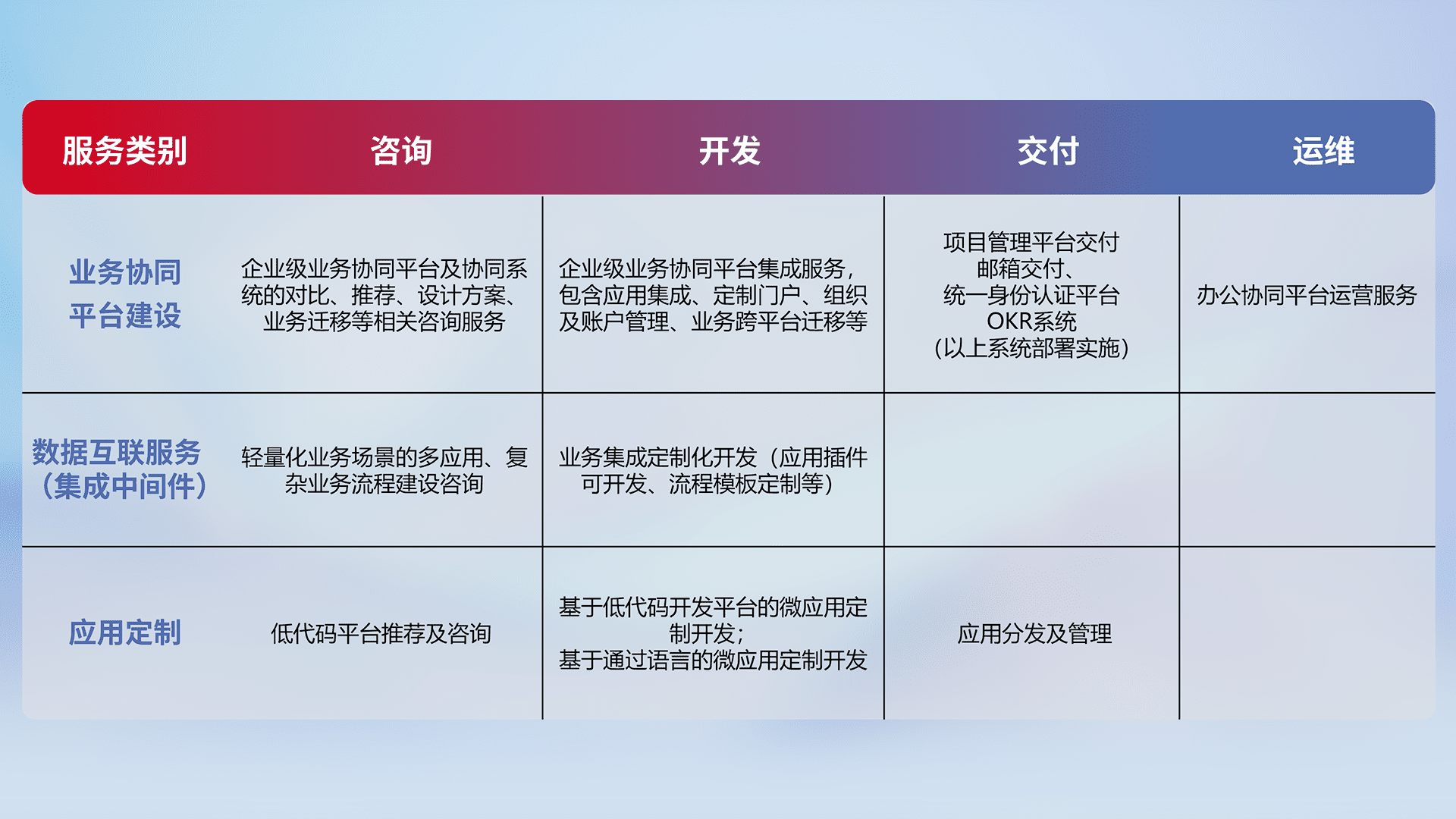 针对钉钉、、企微、、IDaas等平台级产品提供产品的规划、、、、方案、、、、交付、、、定制化开发等服务,,,,实现如统一协同办公、、、智能客户服务、、、、混合会议管理、、、智能数据查询、、等业务场景,,,,实现数字化转型。。。
